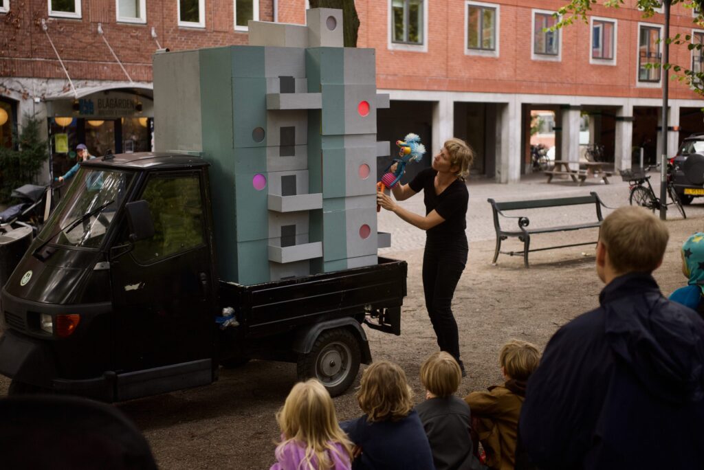 Et dukketeater for børnehavebørn, der foregår i et højhus bygget på en tuktuk.